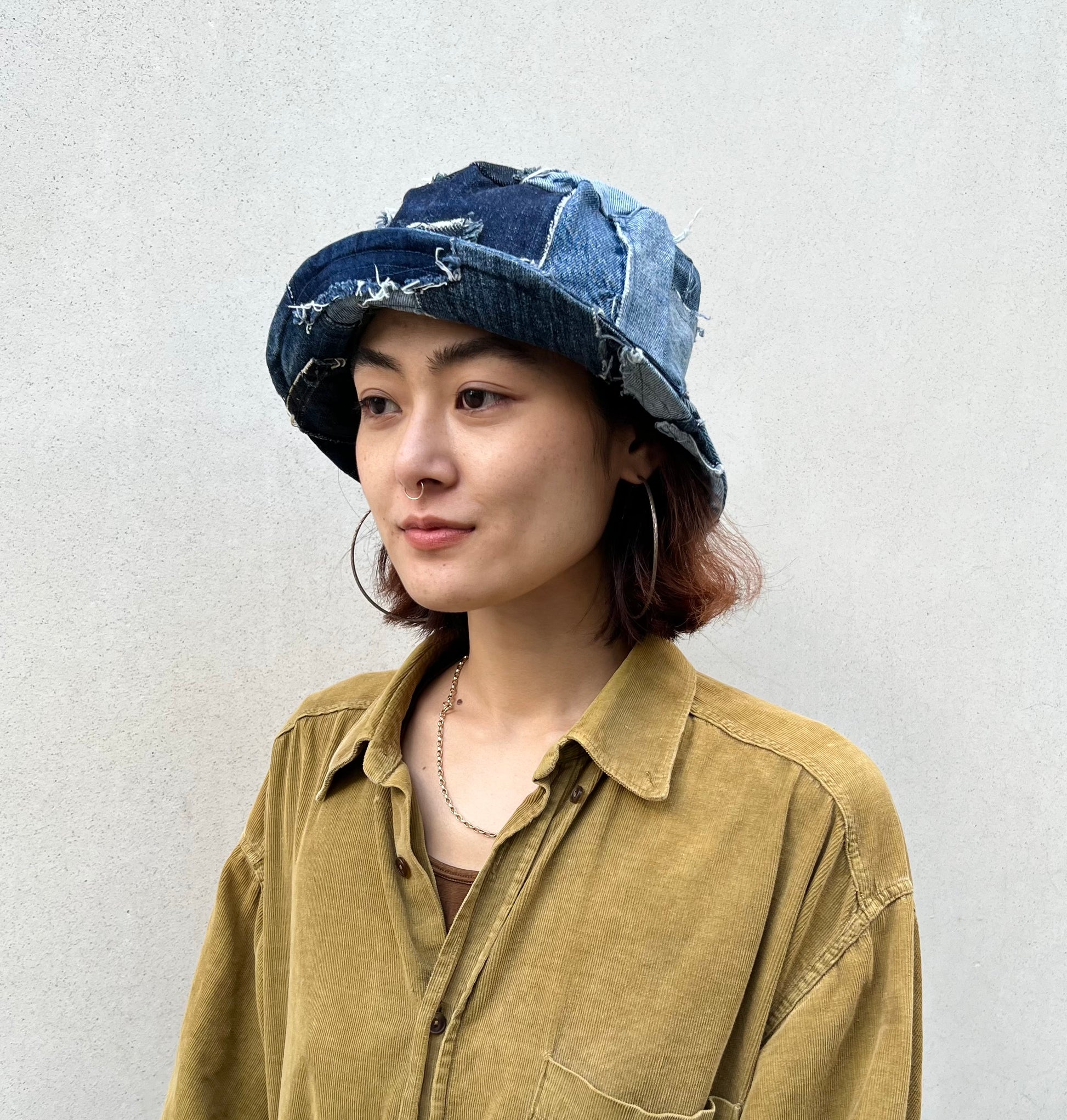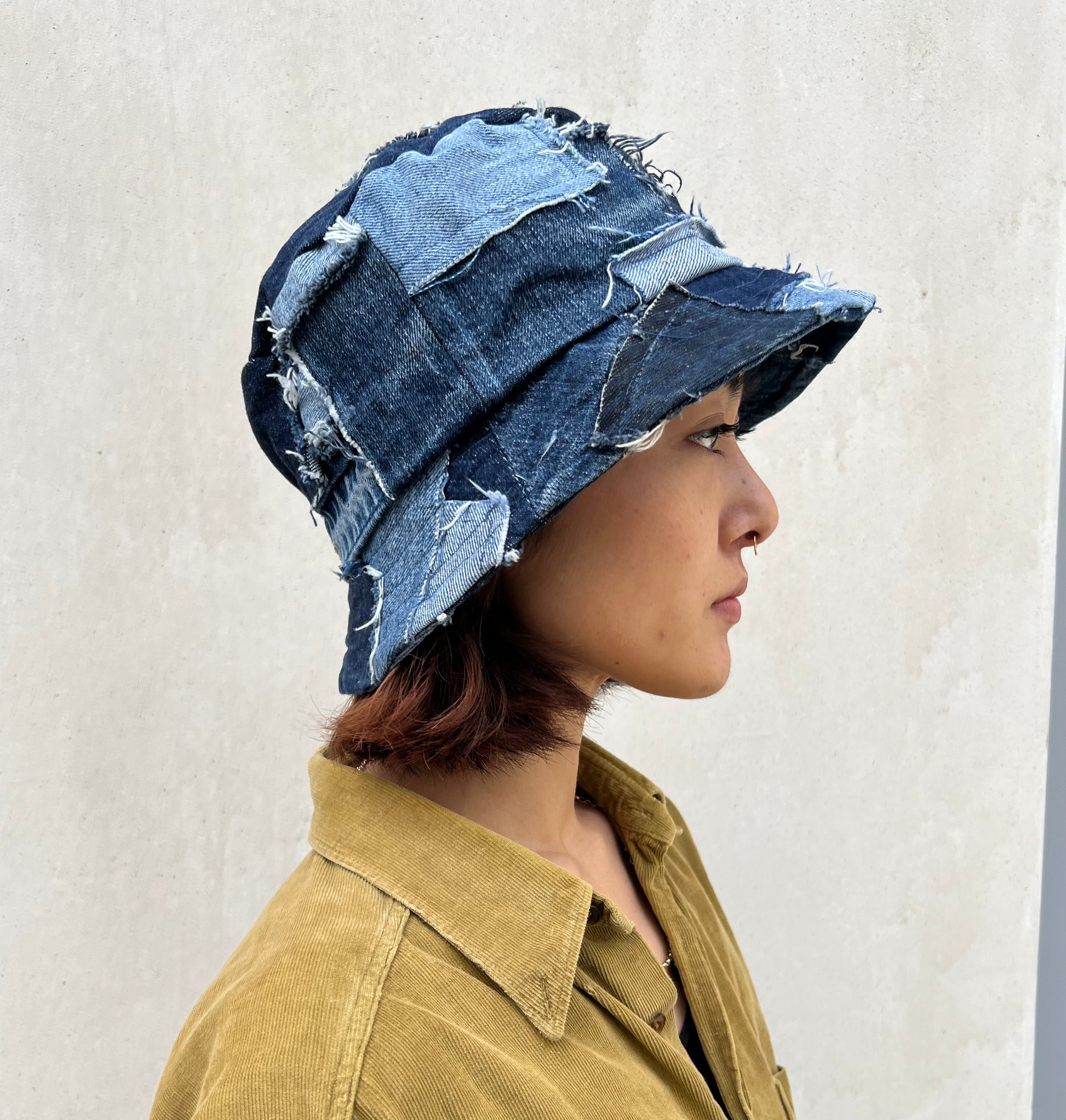Handmade patchwork denim bucket hat made with different shade of recycled denim